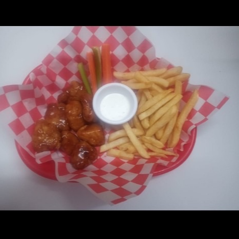 10 BONELESS BAÑADOS EN LA SALSA DE TU PREFERENCIA Y 230 GRAMOS DE PAPAS, ACOMPAÑADOS CON ADEREZO RANCH, CATSUP Y BASTONES DE APIO Y ZANAHORIA