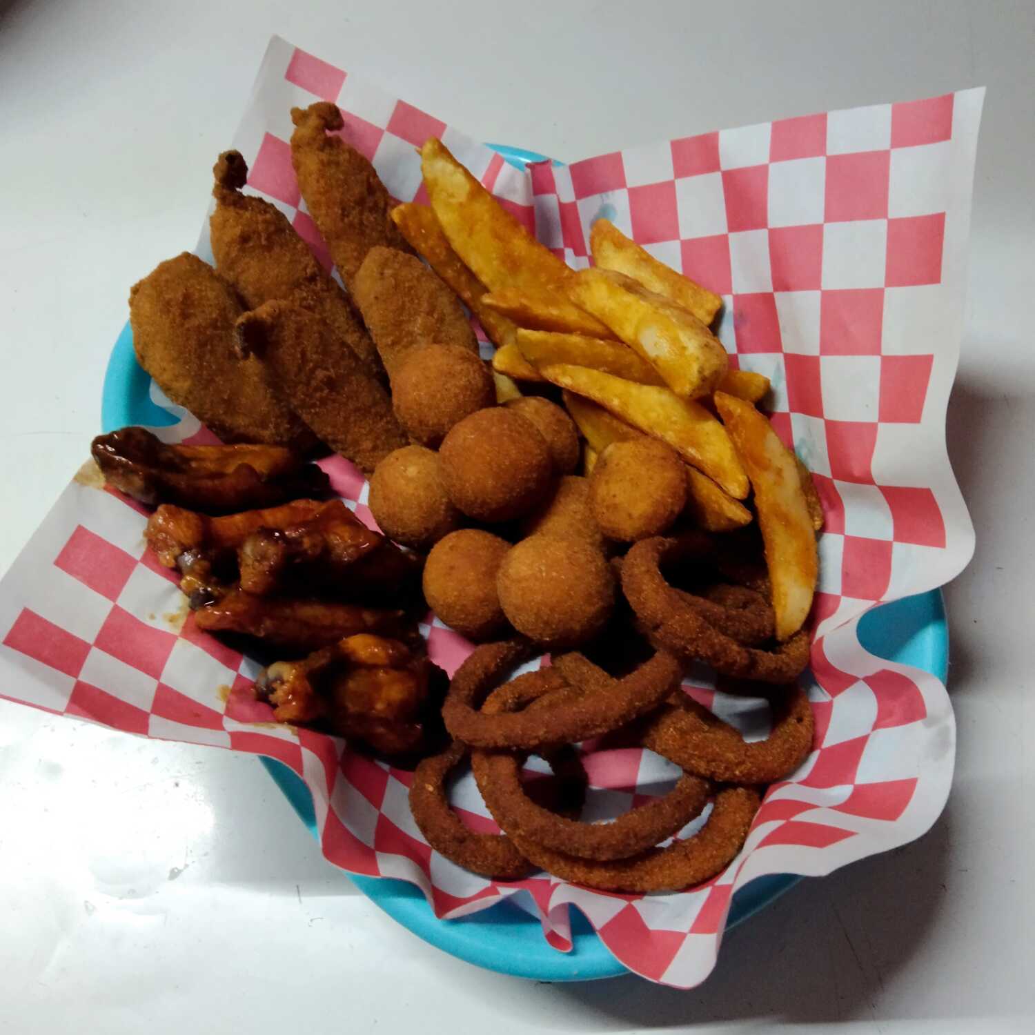 5 ALITAS, 5 JALAPEÑOS POPPERS, 8 PAPAS SHAMBROCKS, 8 AROS DE CEBOLLA Y 200 GRAMOS DE PAPAS GAJO