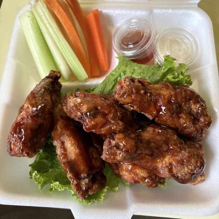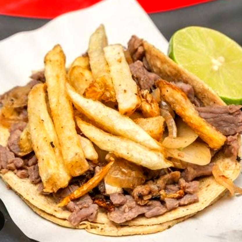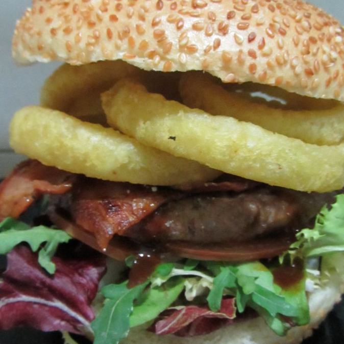 Medallón de rez, jitomate, cebolla, chiles en vinagre, catsup, mostaza, mayonesa,aros de cebolla