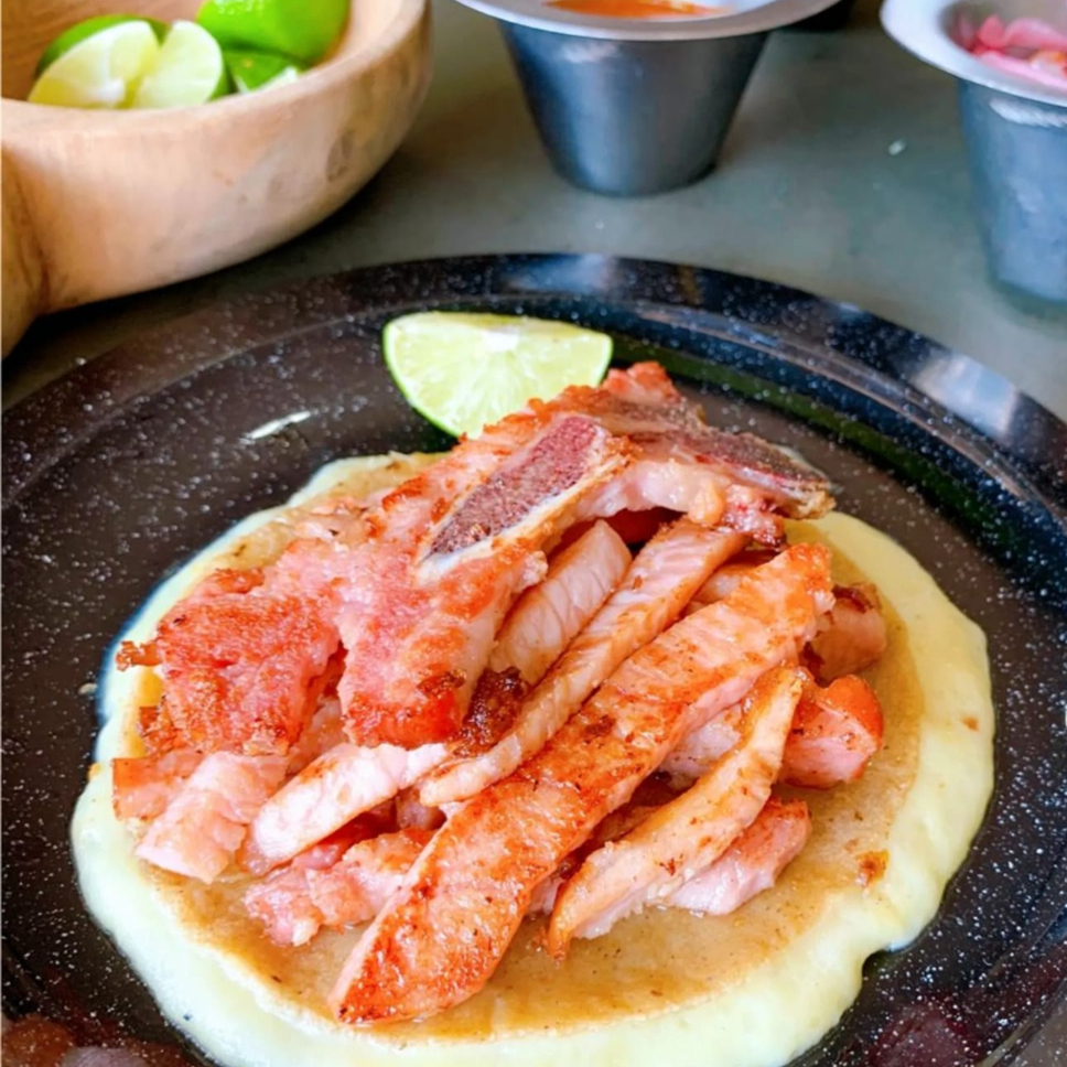 Queso amarillo,queso Oaxaca, chiles en vinagre, cebolla, jitomate, frijoles, milanesa de puerco
