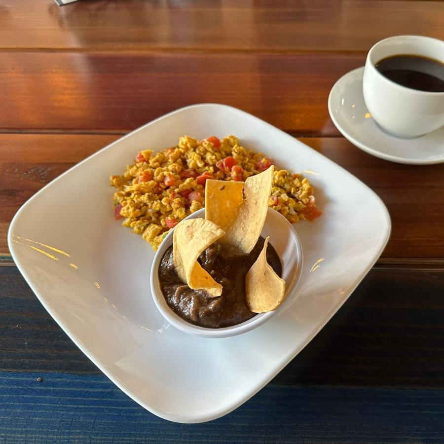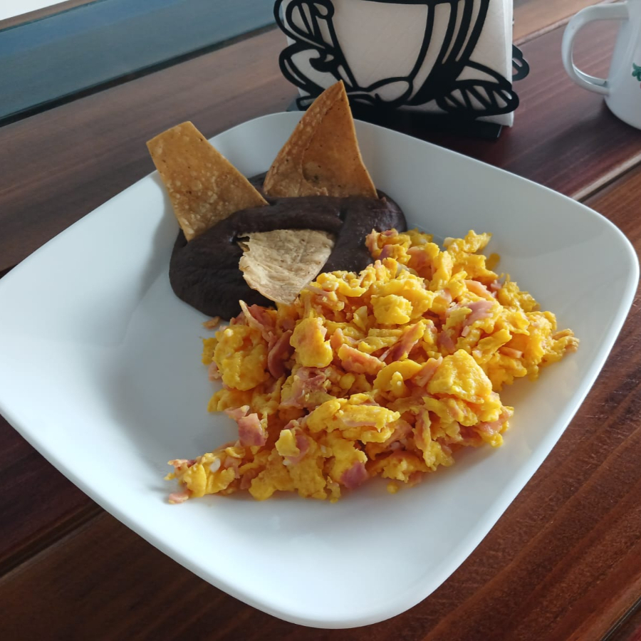 Tres huevos revueltos con jitomate cebolla y chile serrano, acompañado de frijoles molidos negros