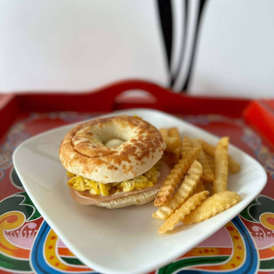 BAGEL, JAMÓN, QUESO Y HUEVO*1 + PAPAS FRITAS (300 GRAMOS)*1