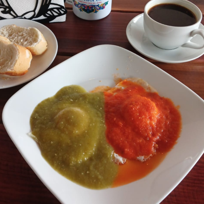 Dos huevos bañados en salsa roja y verde acompañado de frijoles molidos negros