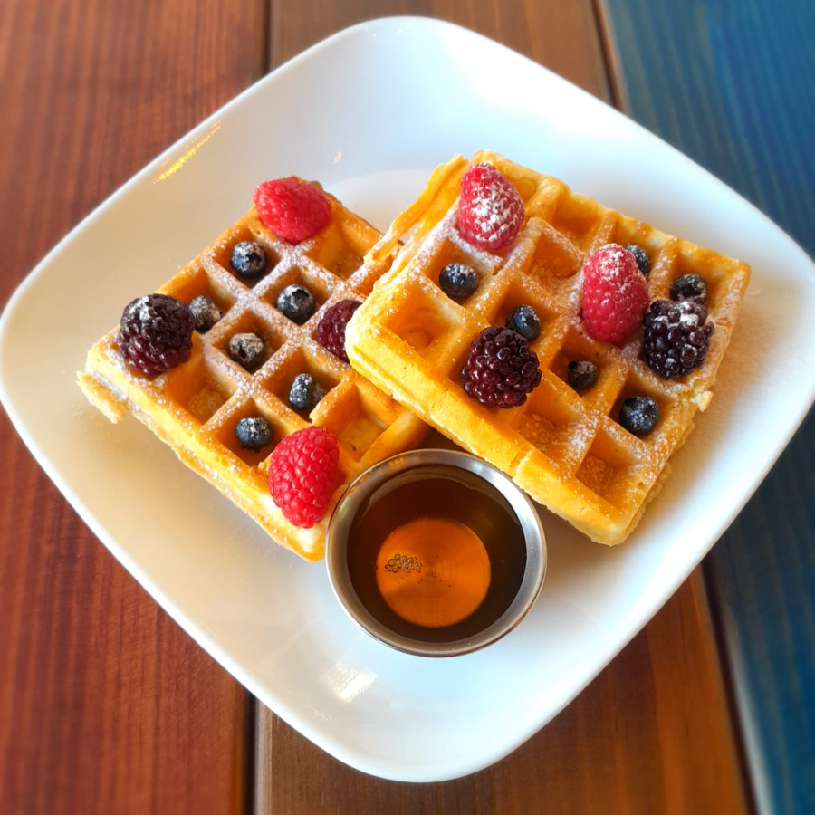 Dos porciones de Waffles con frutos rojos, un toque de azúcar Glass y jarabe sabor a Maple