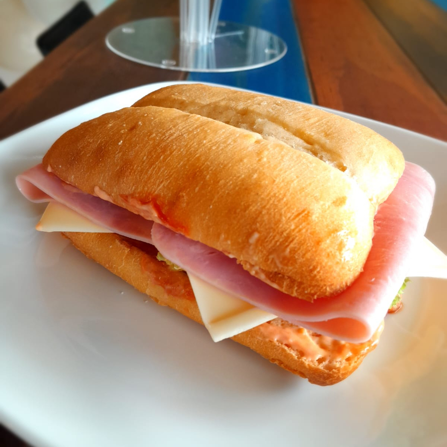 Pan artesanal con especias , jamón de pavo , queso, jitomate, lechuga y un toque de mayonesa.