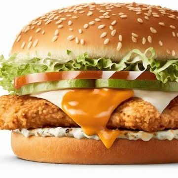 Pollo empanizado con dos quesos, pepinillos, jalapeño, lechuga y jitomate