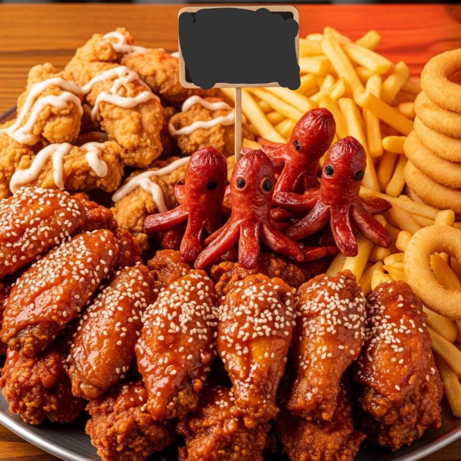 1 kilo de alitas, 1/2 kilo de bonneles, papas a la francesa, aros de cebolla, salchipulpos