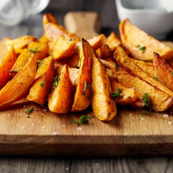 Cubitos de pollo cubiertos de salsa acompañados de bastones