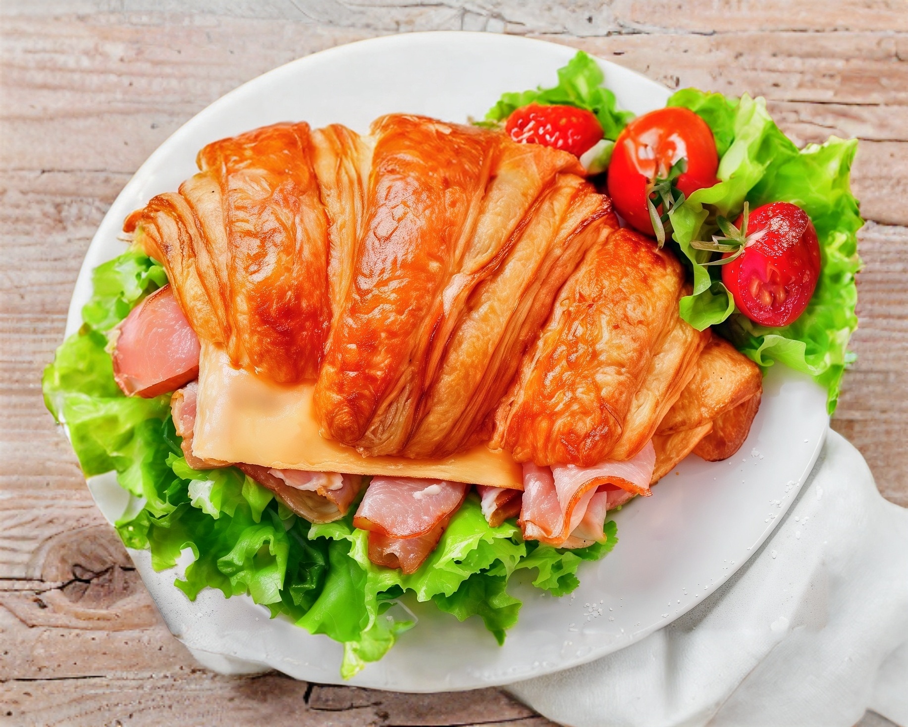 Croissant de Hojaldre, Crujiente por Fuera y Suave por Dentro con su Relleno de Jamón y Queso Manchego, Tiene un Sabor Intenso, un Aroma Dulce y Una Textura Hojaldrada que No te Dejará Indiferente.