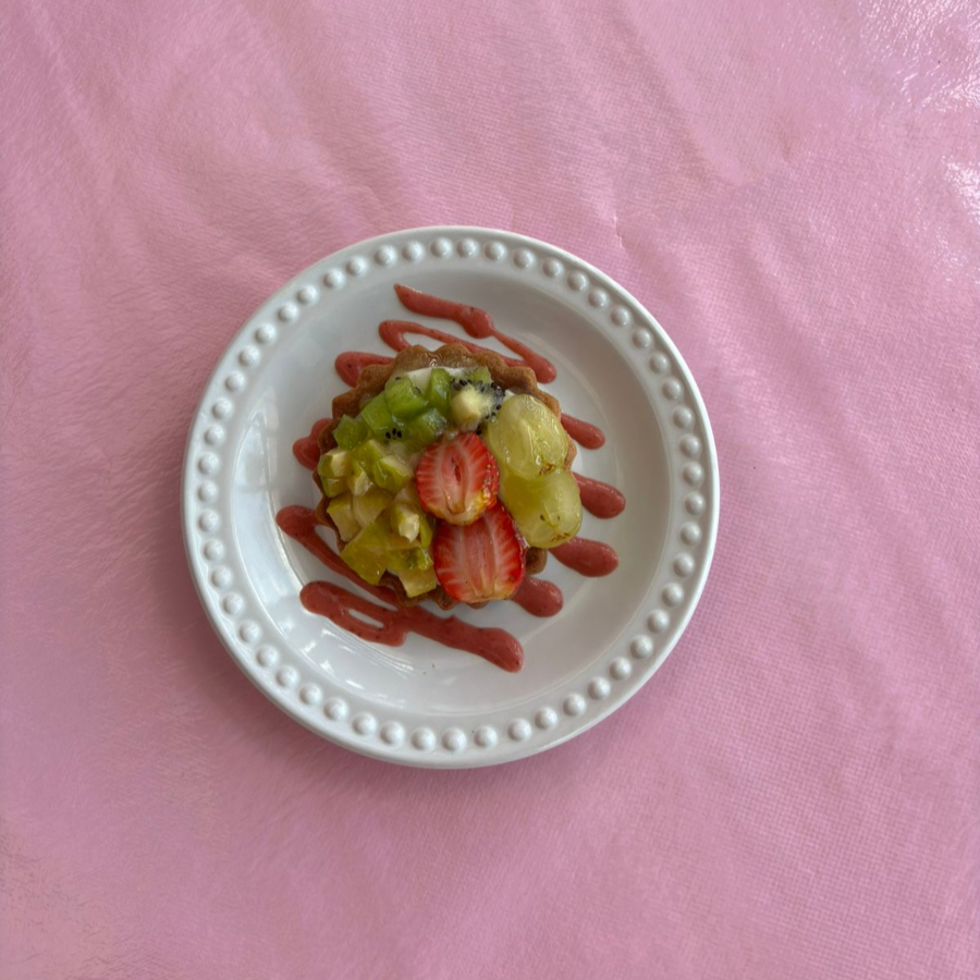 Waffle crujiente y fruta fresca de temporada con tu topping dulce favorito para hacerlo único