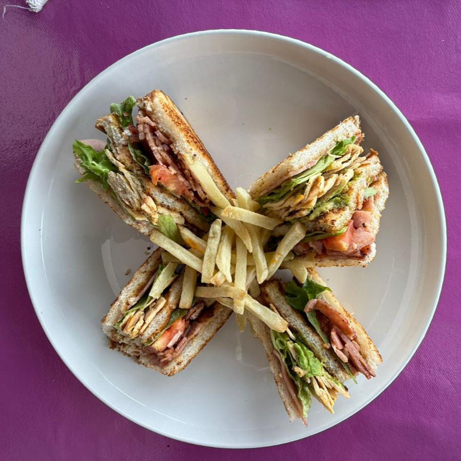 Pan tostado se intercala con pollo, jamón, quesos, tocino crujiente, verduras frescas; acompañado con una porción de papas crujientes.