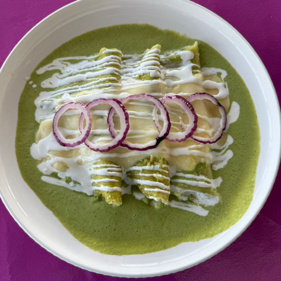 Tortillas de maíz rellenas de jugoso pollo, nadando en un baño cremoso de salsa verde y gratinadas con queso manchego derretido