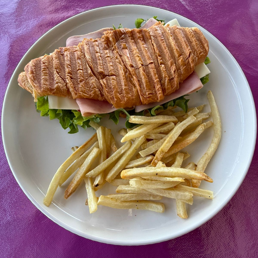 Nuestro croissant artesanal, horneado, se rellena con una generosa porción de jamón, queso y se acompaña con una fresca porción de verduras frescas.
