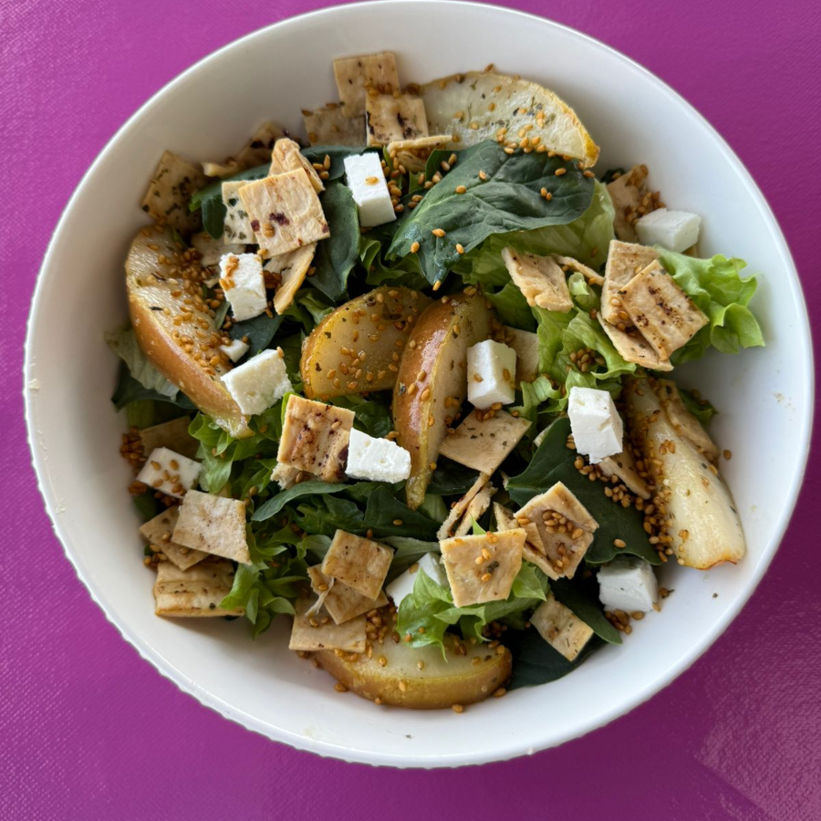Mix de lechuga y espinaca con pechuga de pollo a la planca acompañada de cronotes, queso, ajonjoli.
