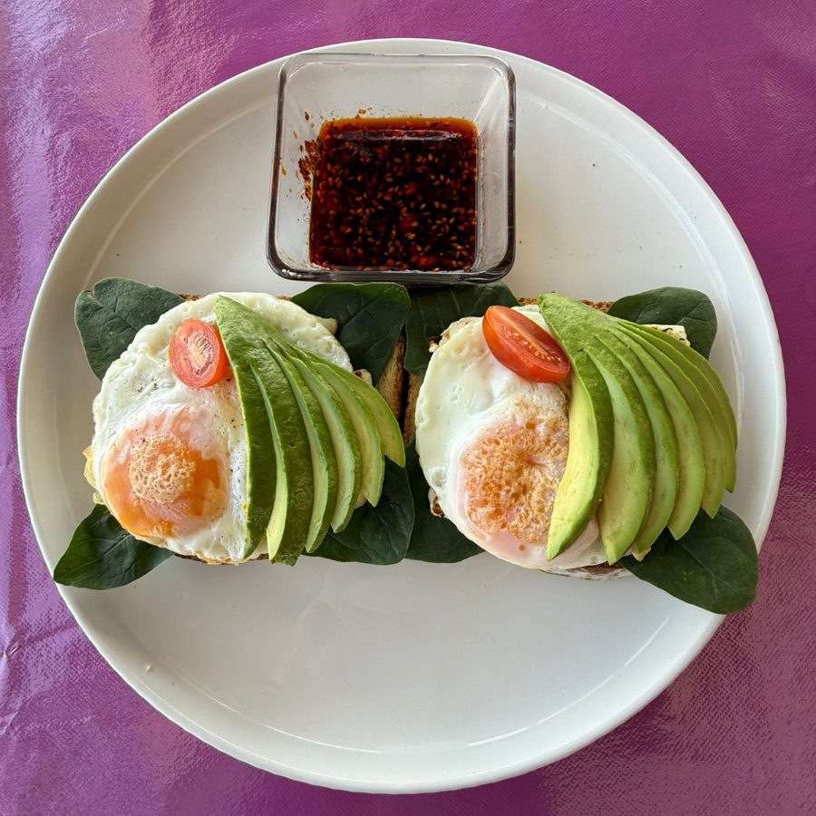 Pan tostado coronado con aguacate fresco machacado con un toque de pimienta, sal de grano y huevo