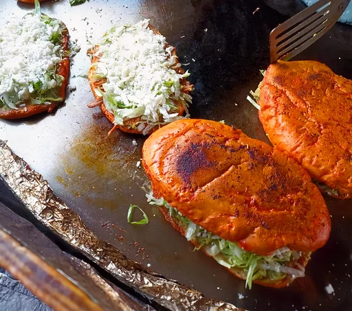 Sope con frijoles, cebolla, lechuga, queso y guisado.