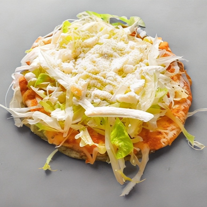 Tlacoyo con salsa a elegir, nopalitos, cebolla y cilantro.