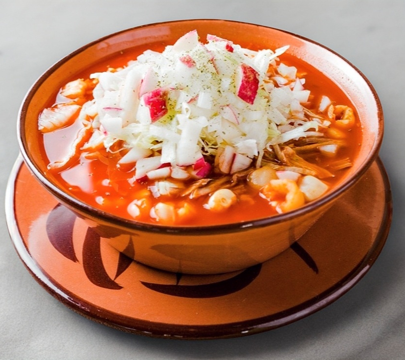 POZOLE ROJO CON LA CARNE DE TU ELECCION ACOMPAÑADO DE VERDURAS Y TOSTADITAS