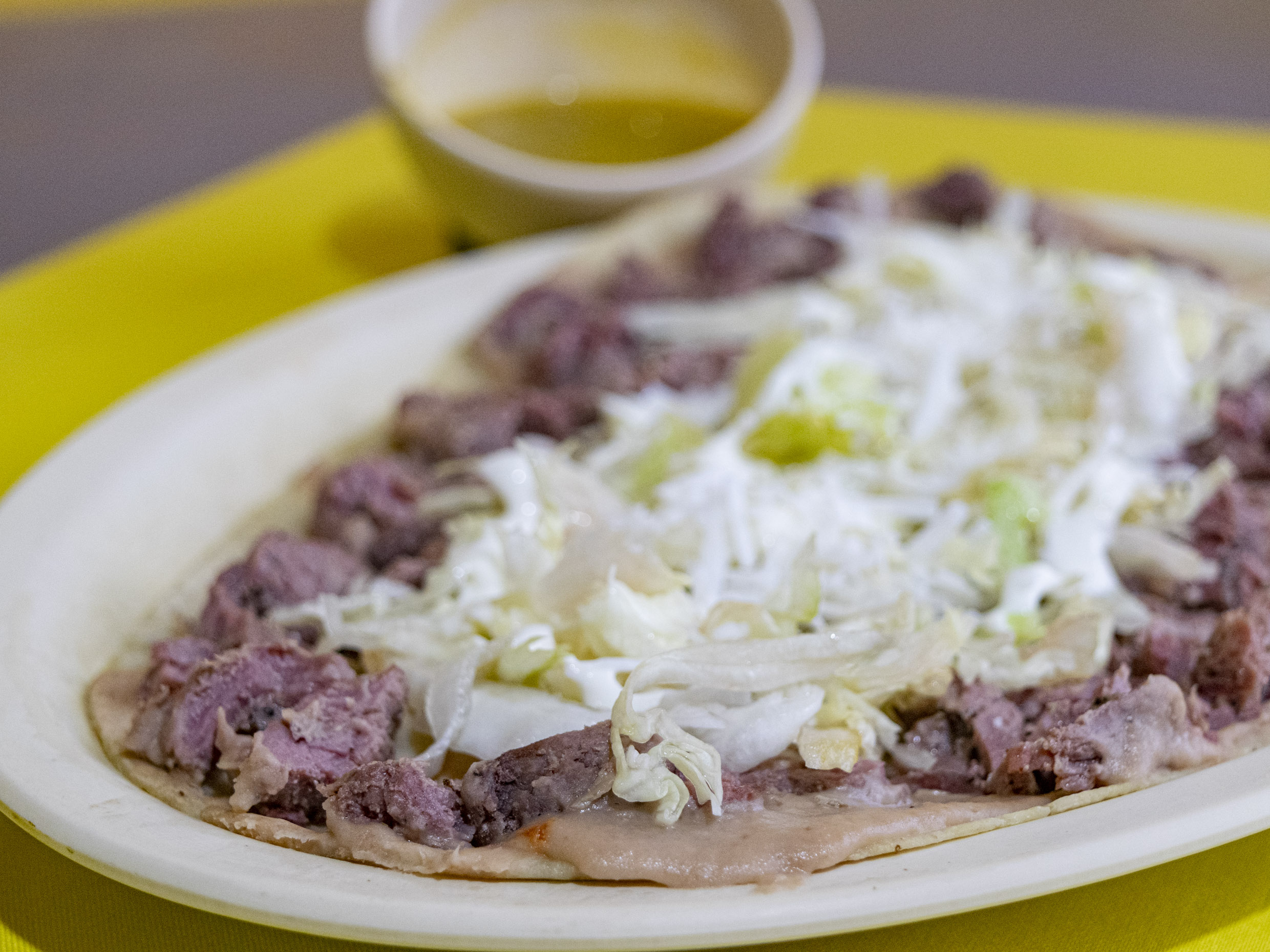 Tortilla de harina y en medio carne con queso y a un costado, lechuga, crema y queso.