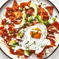 CHILAQUILES ROJOS ACOMPAÑADOS DE POLLO, CREMA, QUESO Y CEBOLLA