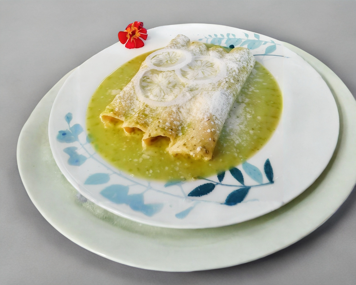 Enchiladas verdes con pollo, gratinadas (2 rollitos).
