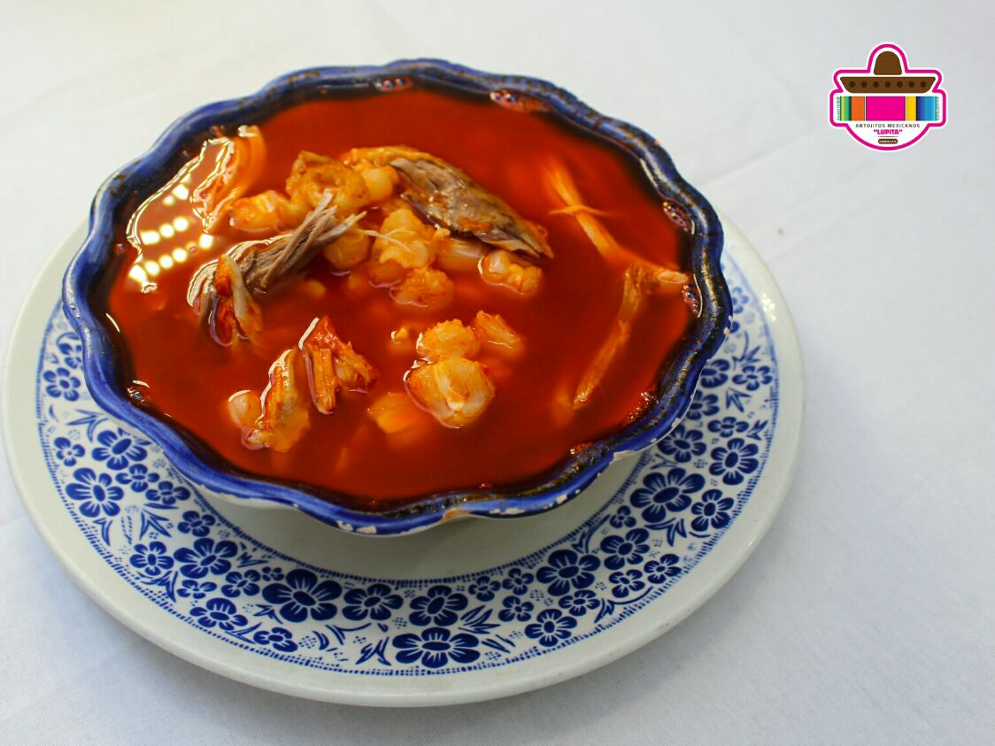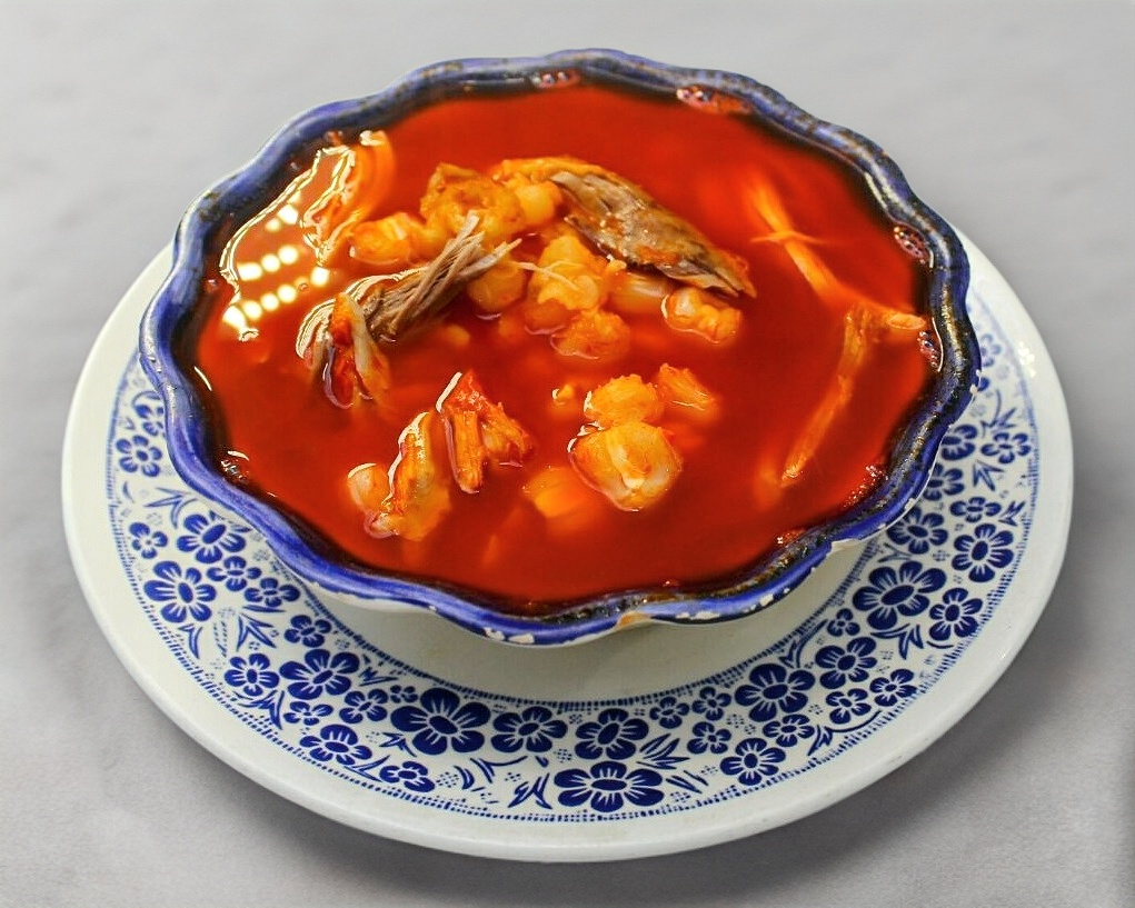 Plato de pozole rojo de cerdo.