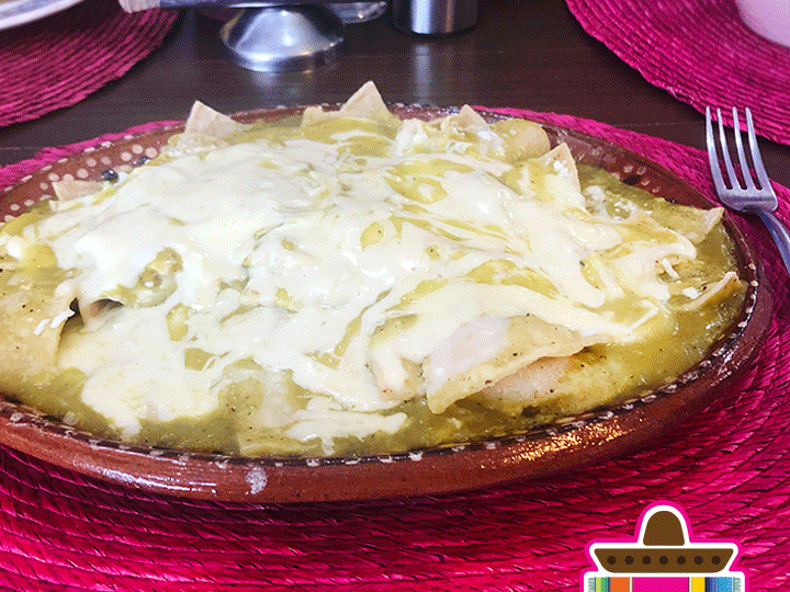 Orden de enchiladas verdes picositas con pollo, chorizo, milanesa, frijoles, crema y queso gratinado.