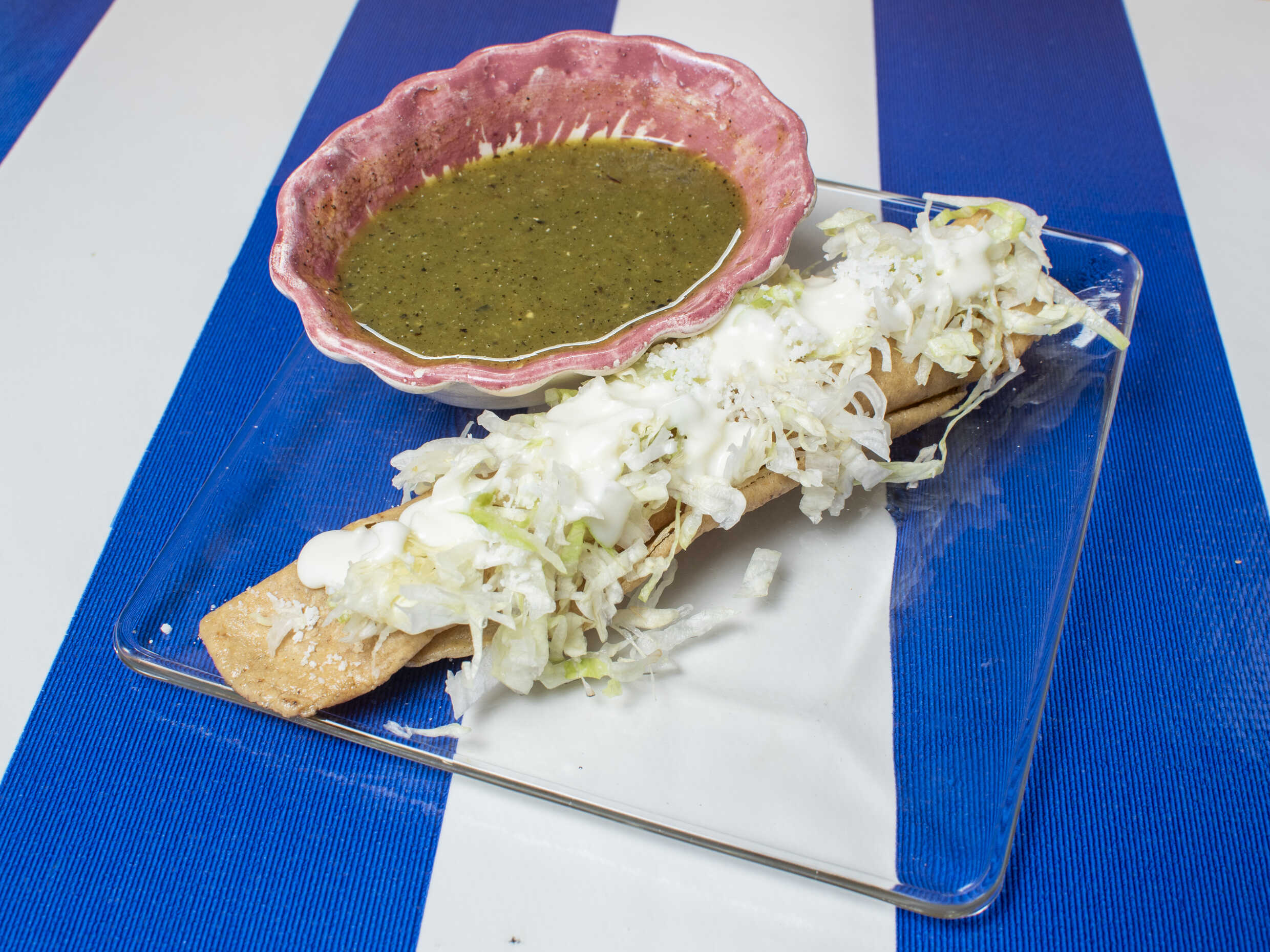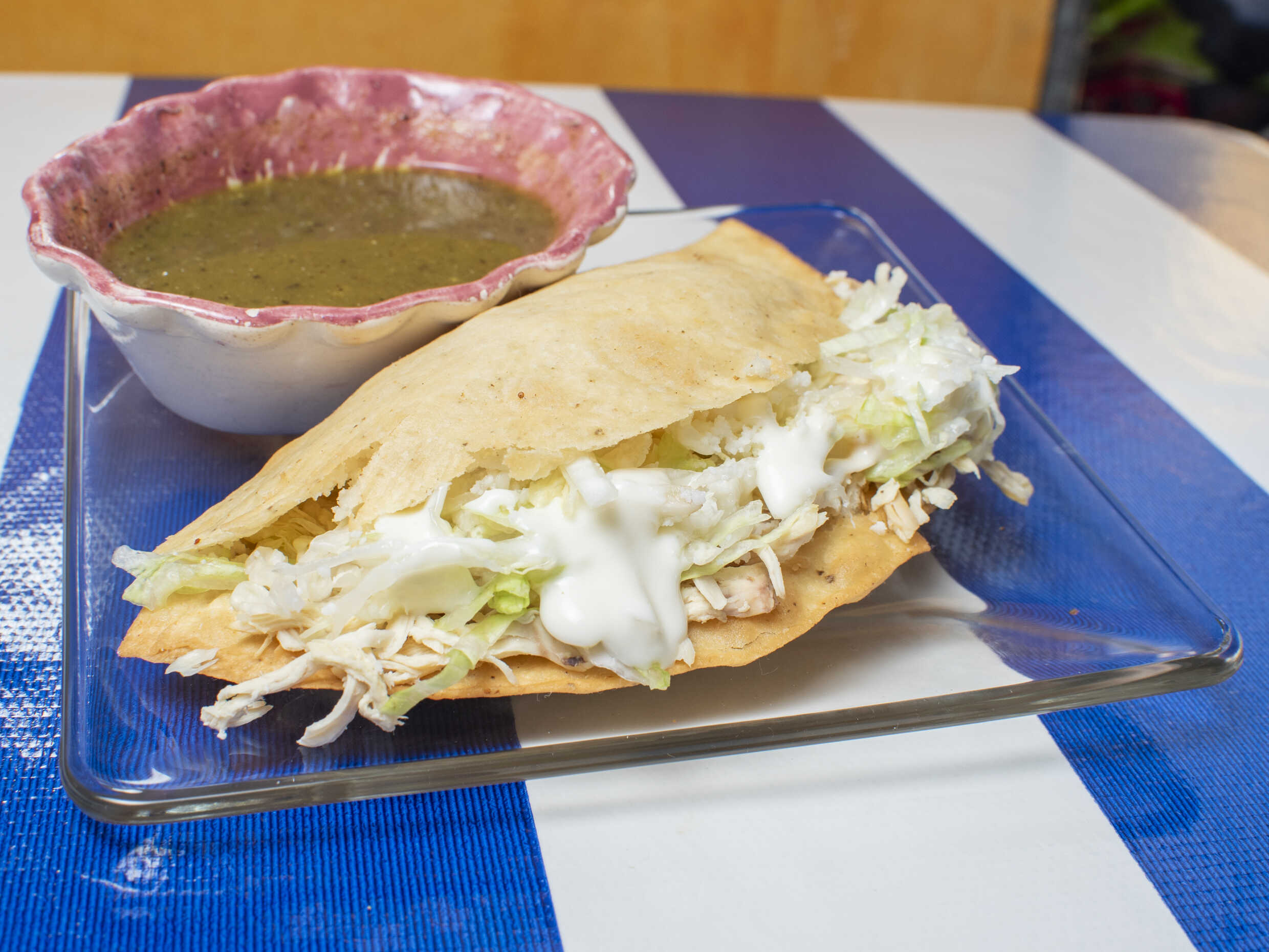 Tortilla de maíz dorada al punto perfecto, rellena de chicharrón prensado y servida con crema, queso y salsa. ¡Una explosión de sabor en cada bocado!