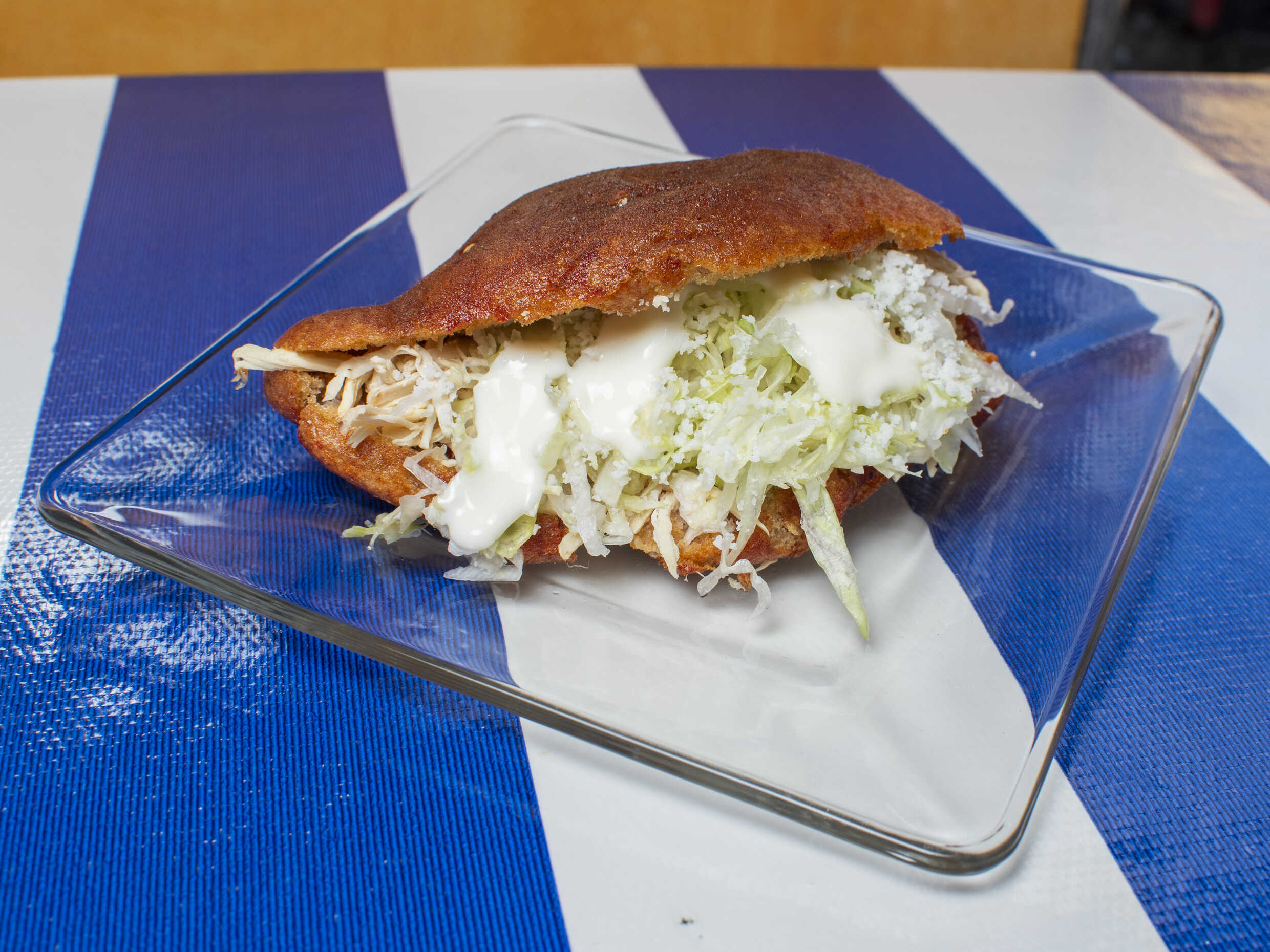 Pan suave y doradito bañado en guajillo, relleno de pollo y coronado con lechuga, crema y queso. ¡El sabor auténtico de la cocina mexicana!