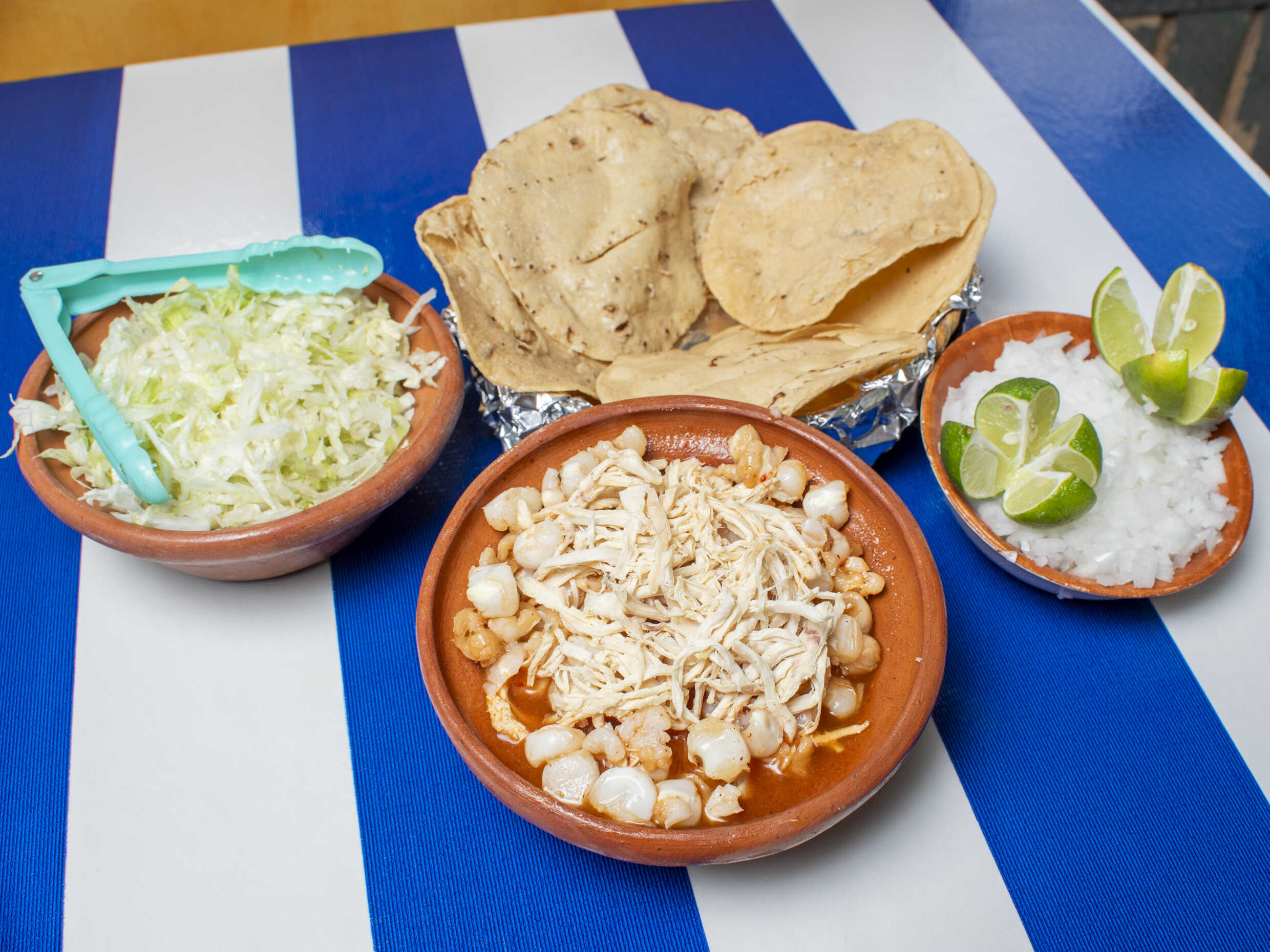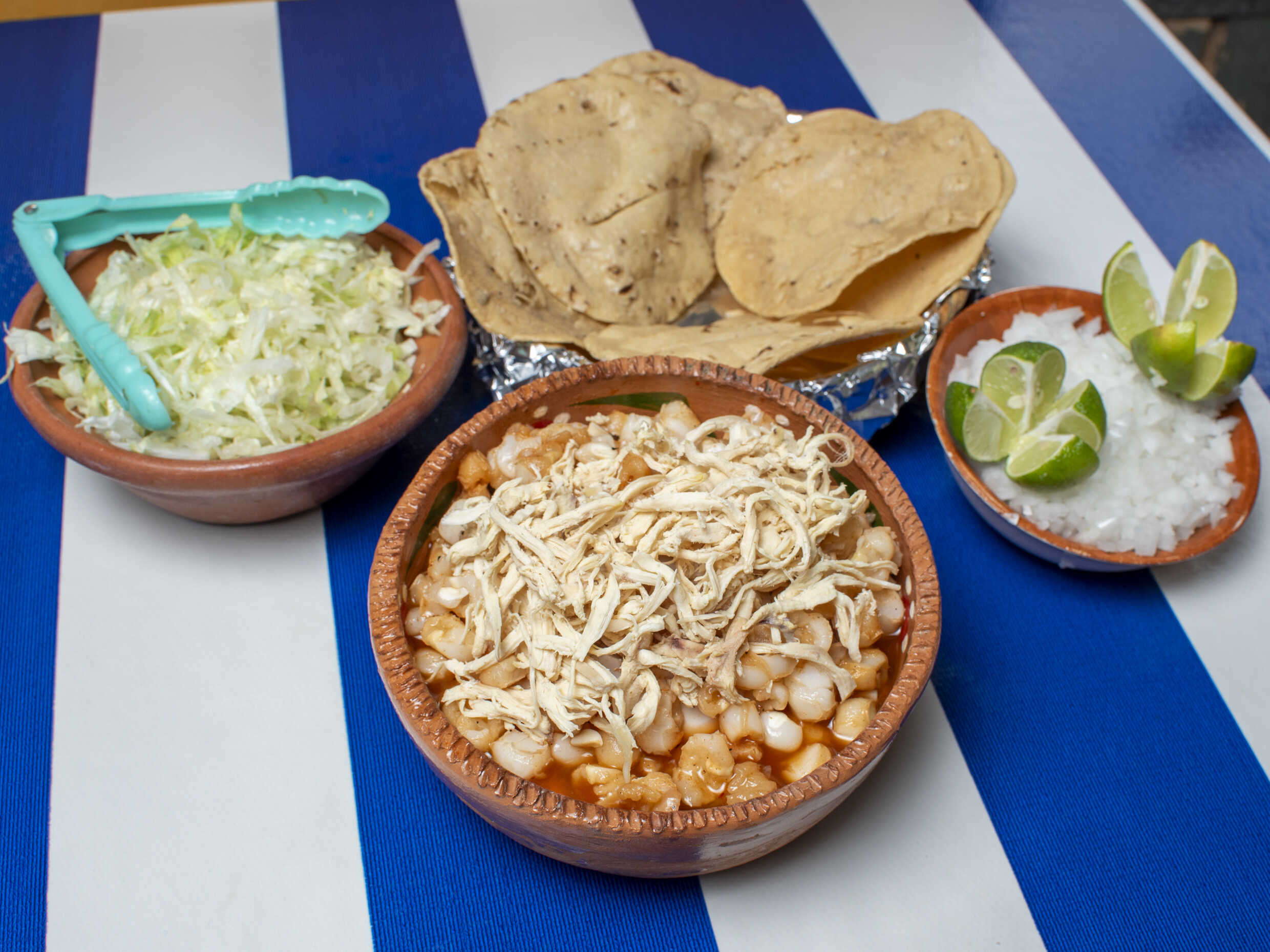 Caldito espeso y aromático con maíz cacahuazintle, carne suave y mucho sazón. Acompañado con tostadas, rábanos, lechuga y orégano. ¡Como en las fiestas mexicanas!