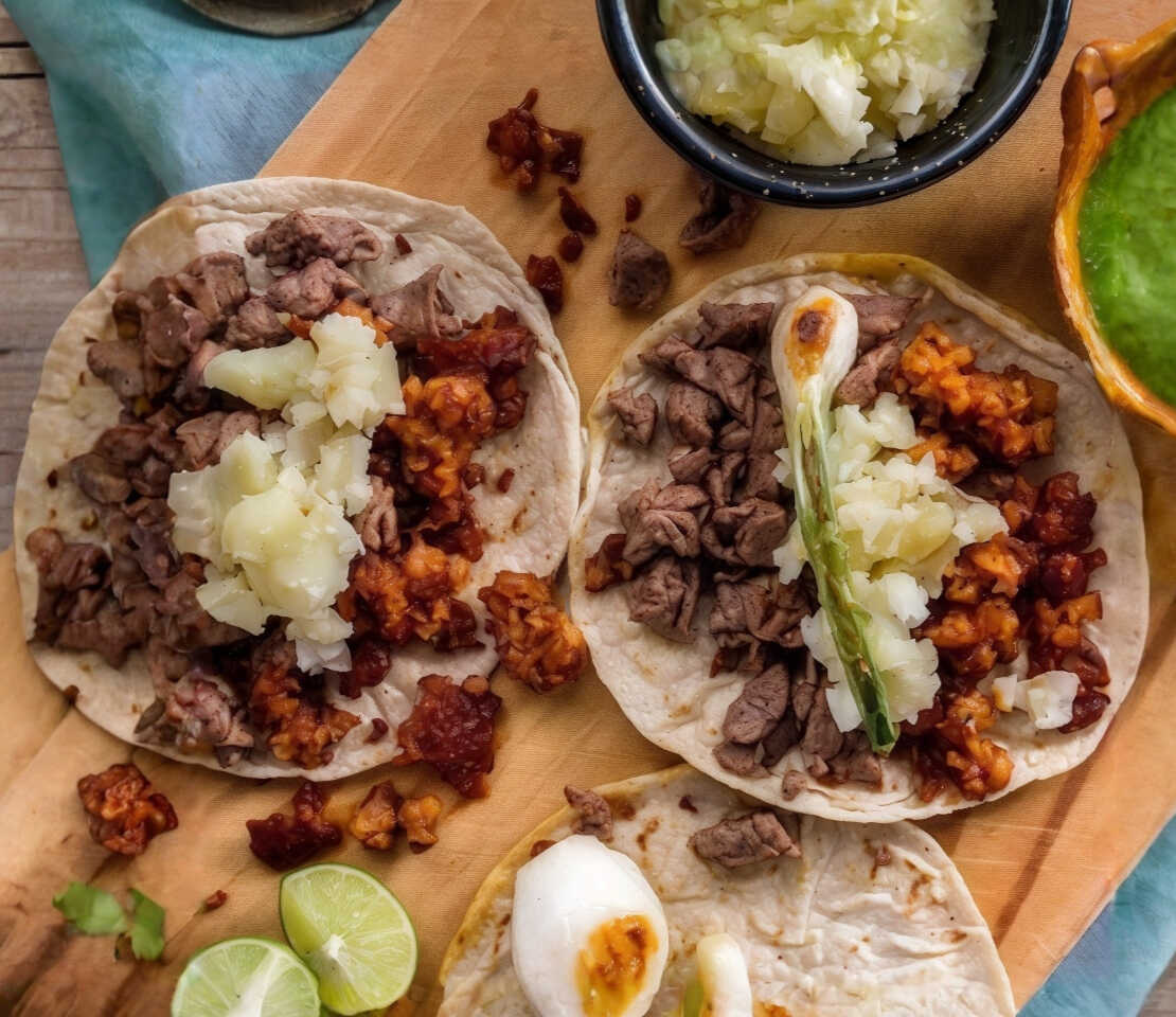 Doble Tortilla, Carne De Bistec Y Longaniza, Cebolla Y Cilantro