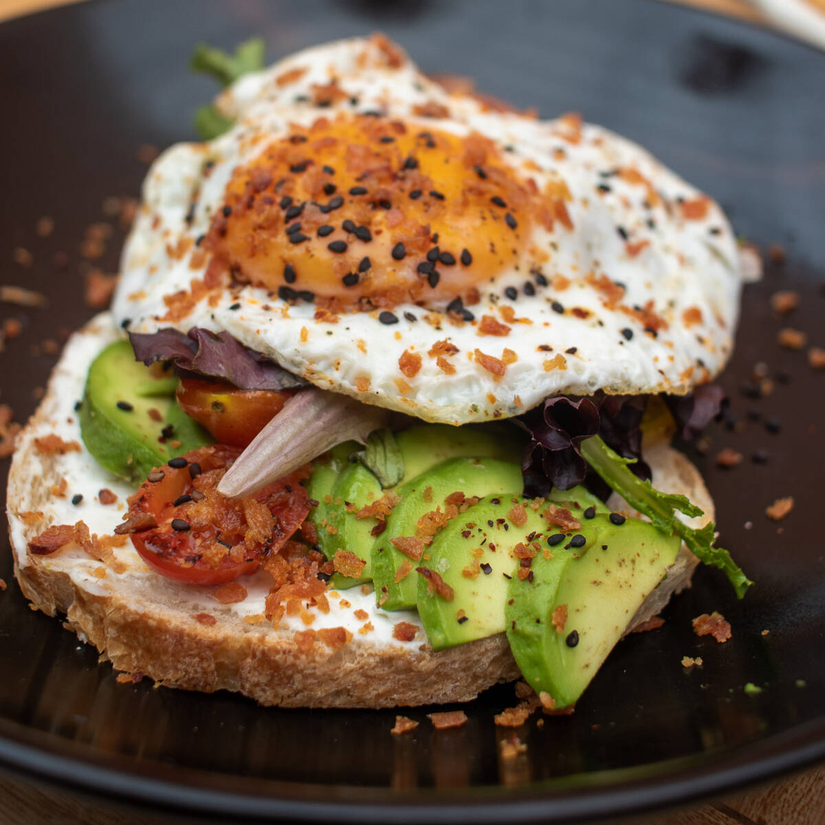Rebanada de pan rustico, mix de lechuga con aderezo de jitomate deshidratado, aguacate rebanado, queso de cabra, jitomate Cherry, un huevo estrellado con ajonjolí negro y hojuelas de chile.