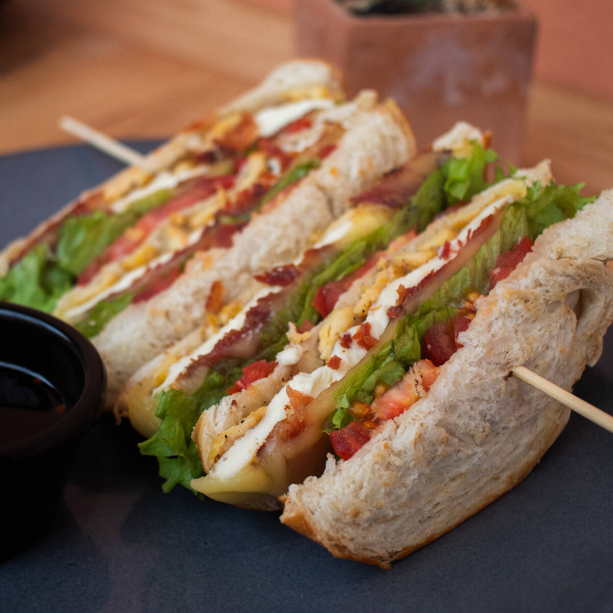 Emparedado con pan de caja casero, con pechuga de pollo, tocino, queso panela, queso gouda, jitomate y lechuga, acompañado de ensalada y salsa macha.