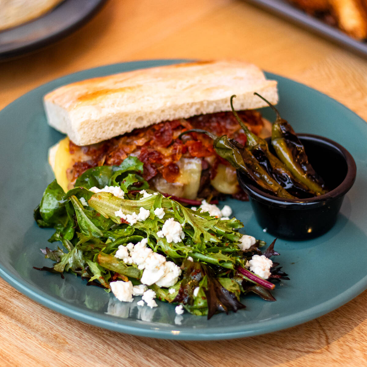 Deliciosa chapata de masa madre con arrachera, mermelada de tocino con cebolla y queso gouda gratinado, acompañada en salsa con aderezo de jitomate deshidratado.