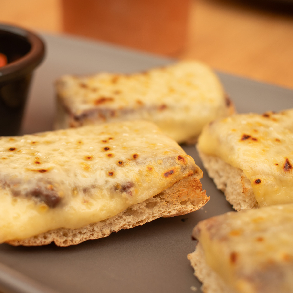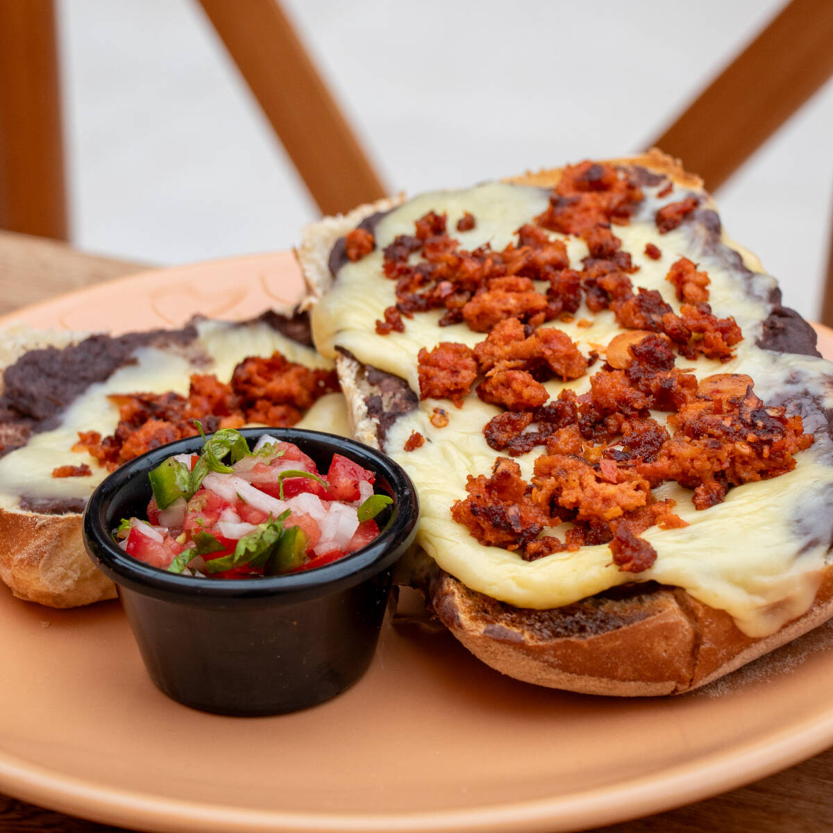 Pan chapata con frijoles refritos, gratinados con queso gouda, acompañados de pico de gallo.
