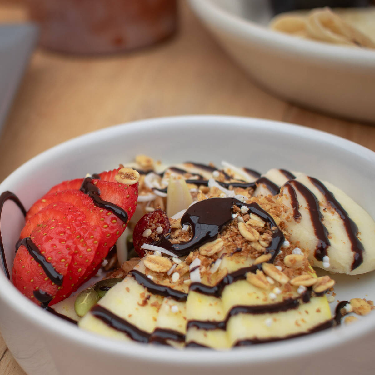 Masa clásica, acompañados de fresa, blueberries, plátano, granola y salsa de chocolate.