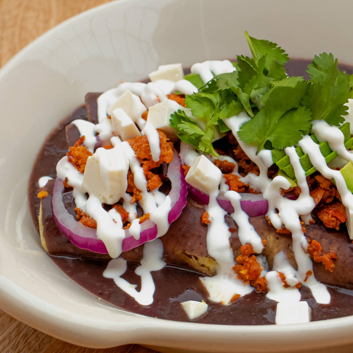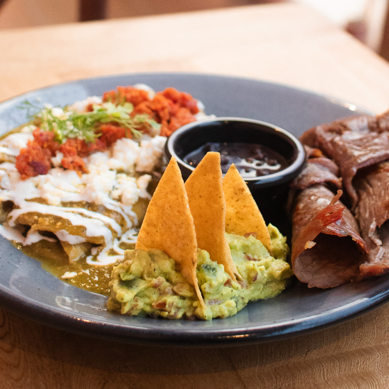 3 tortillas rellenas de huevo revuelto, bañadas en una deliciosa salsa de frijol con hoja de aguacate y chile de árbol, decoradas con crema, queso panela, chorizo (70 gr) y aguacate.
