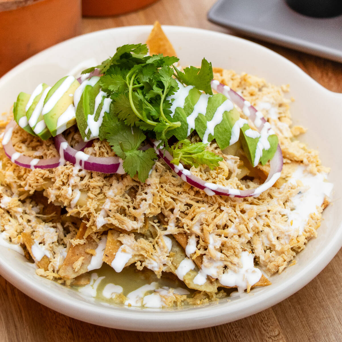 Totopos bañados en nuestra tradicional salsa a base de tomate verde tatemado, decorados con pollo deshebrado (70 gr) crema, queso panela y aguacate.