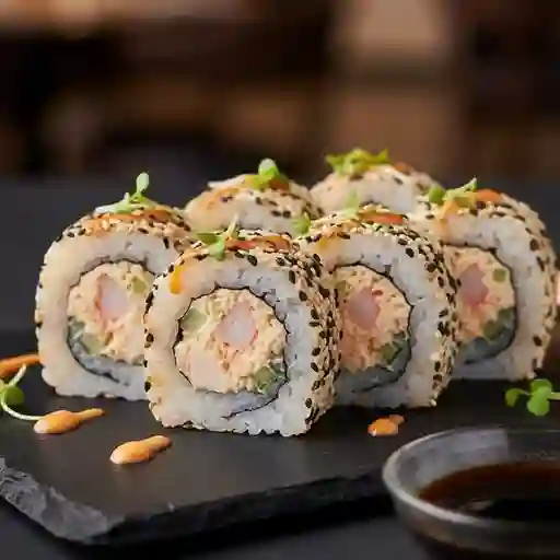 Rollo de sushi relleno con ensalada tampico procesada de la casa. Cubierto con mix de ajonjolí.