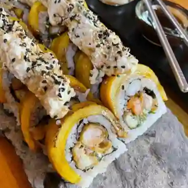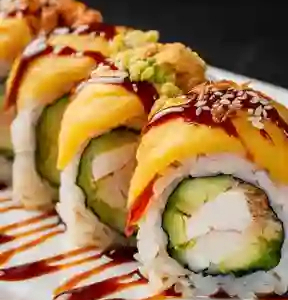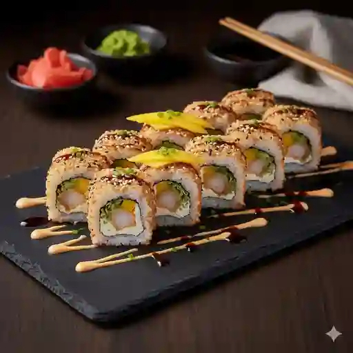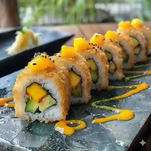 Rollo relleno de camarón empanizado, queso crema y pepino. Cubierto con láminas de mango fresco, salsa de anguila y ajonjolí.