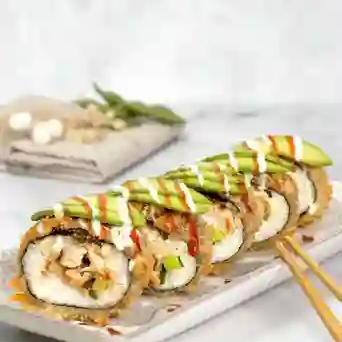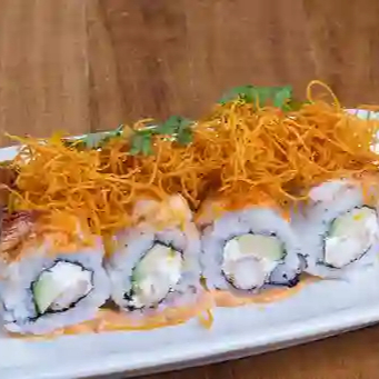 Relleno de queso crema y aguacate. Cobertura de láminas de pollo, ensalada tampico y mix de ajonjolí.