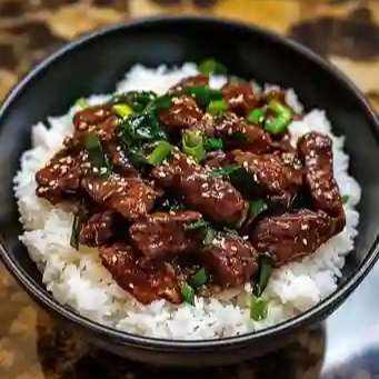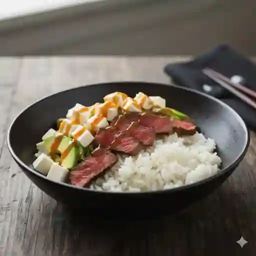 Arroz blanco al vapor coronado con filete de res sellado y bañando en salsa teriyaki dulce.