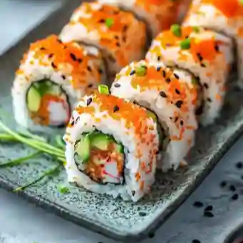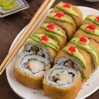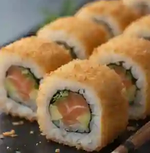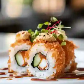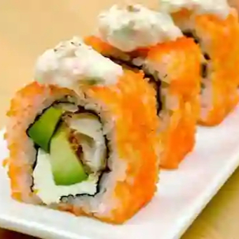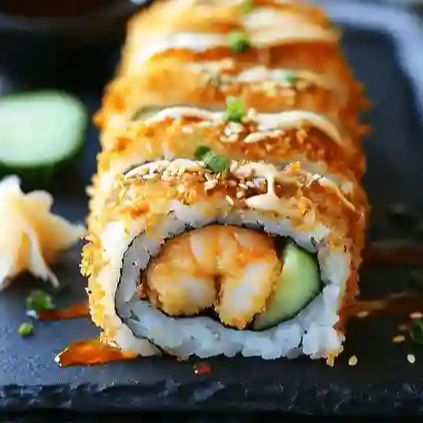 Interior de camarón empanizado y pepino. Exterior cubierto con pasta de surimi, queso crema y un toque de mayonesa chipotle.