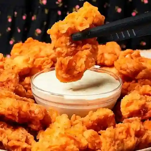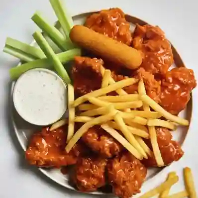 Trozos de pechuga de pollo fritos, 1 salsa, 1 dip ranch, blue cheese, apio, zanahoria y papas a la francesa 750 g.