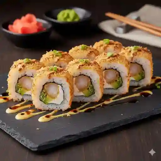 Combinación de camarón empanizado, aguacate y pepino. Cubierto con capa de queso crema y semillas de ajonjolí.