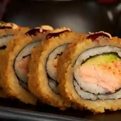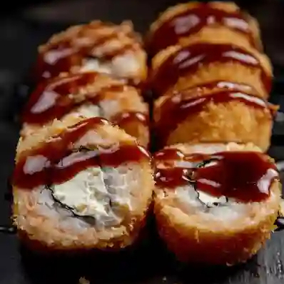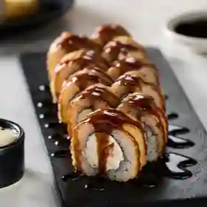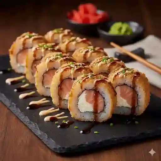 Rollo con técnica de tempurizado relleno de salmón fresco y queso crema. Servido con salsa de anguila.