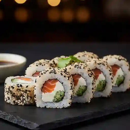 Rollo con salmón fresco y queso crema, acompañado de pepino. Decorado con mix de ajonjolí.