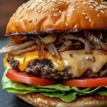 Una hamburguesa a base de mayonesa, queso cheddar, queso estilo americano, lechuga, jitomate, chiles, 2 pzas de aros de cebolla y 2 carnes de res bañada en salsa BBQ. 100 g De papas francesas 360 g.