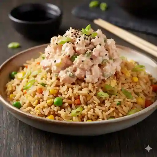 Arroz frito con verduras, servido con una porción de ensalada tampico de la casa en la parte superior.