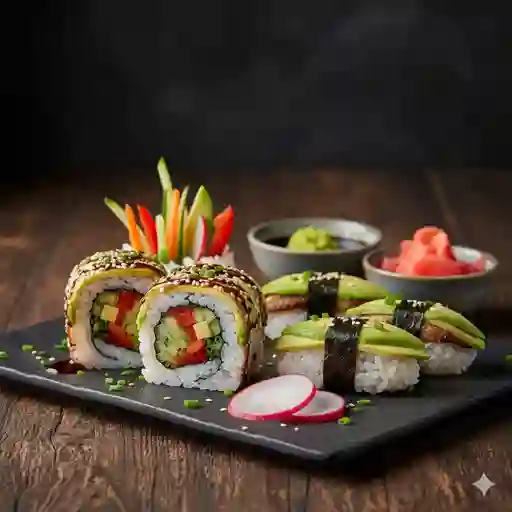 Rollo de sushi fresco integrado por pepino, aguacate y zanahoria. Cubierto con mix de ajonjolí.